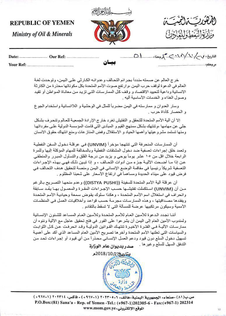 أكدت وزارة النفط والمعادن اليمنية، إن عرقلة آلية الأمم المتحدة للسفينة (( DISTYA PUSHI )) وعم منحها التصاريح بالرغم من أن (UNVIM)، استكملت تفتيشها حسب الإجراءات المقره والمعمول بها يعد سابقة وانحراف في استغلال أسم الأمم المتحدة.