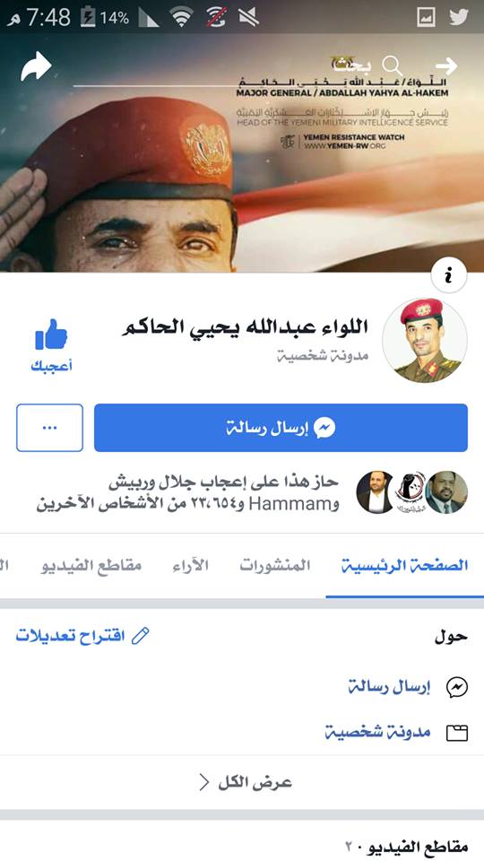 نفى رئيس هيئة الاستخبارات العسكرية والاستطلاع، اللواء عبدالله يحيى الحاكم، وجود أي صفحة أو حساب باسمه على مواقع التواصل الاجتماعي.
