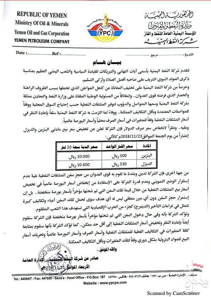 بيان هام لشركة النفط تعلن فيه تخفيض أسعار المشتقات النفطية كما تدين حجز تحالف العدوان السعودي للبواخر واثر ذلك على استمرار تخفيض أسعار المشتقات