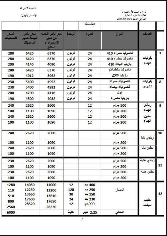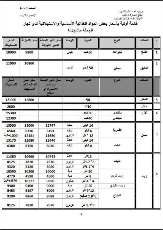 وزعت وزارة الصناعة والتجارة قوائم أولية بأسعار عدد من المواد الغذائية الأساسية والاستهلاكية المخفضة لدى تجار الجملة والتجزئة.