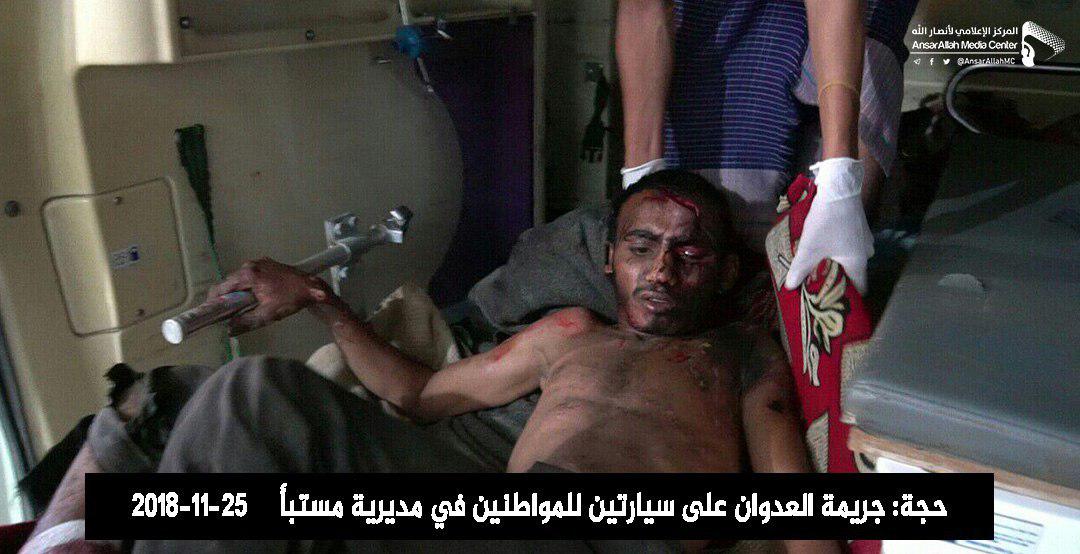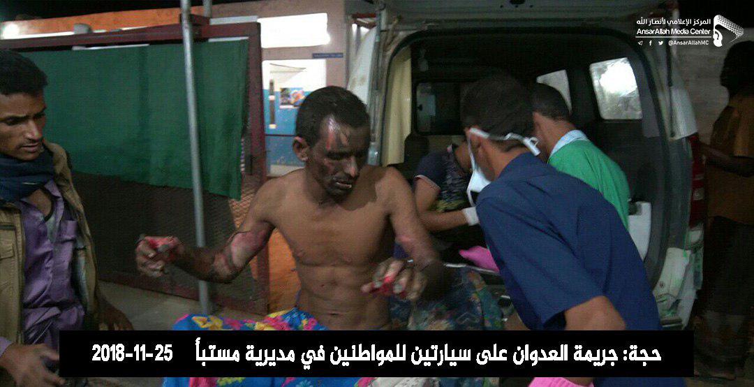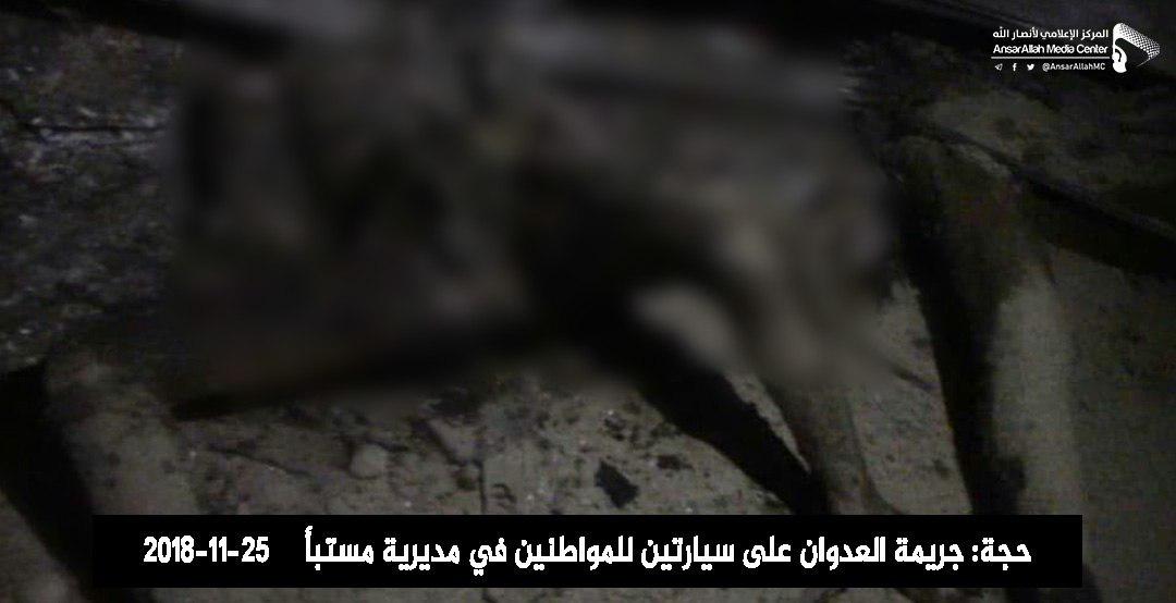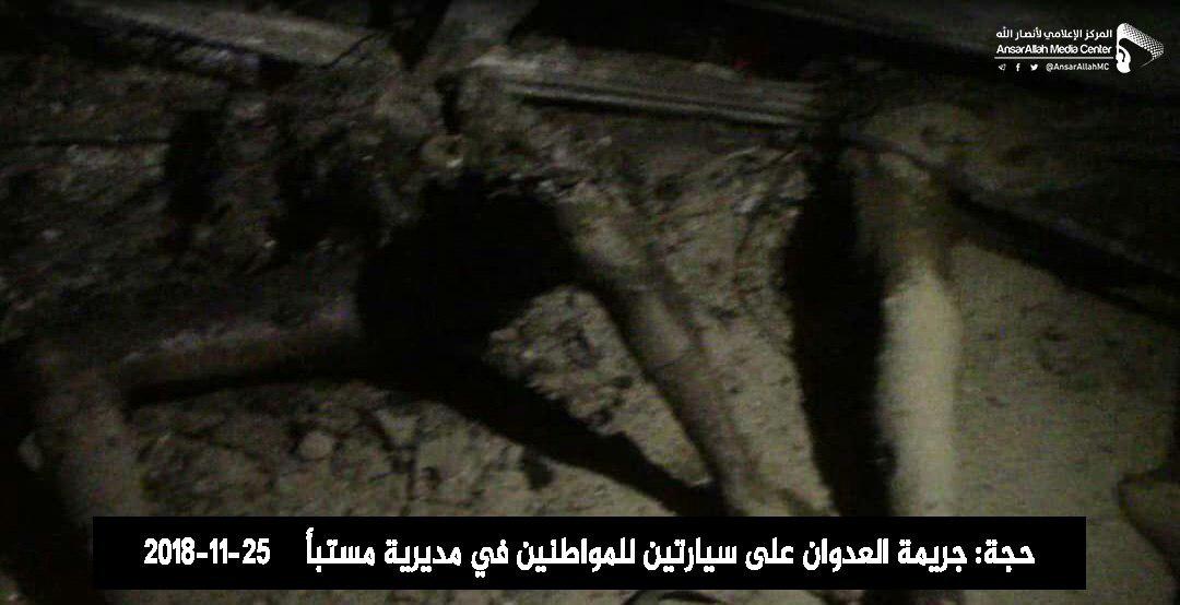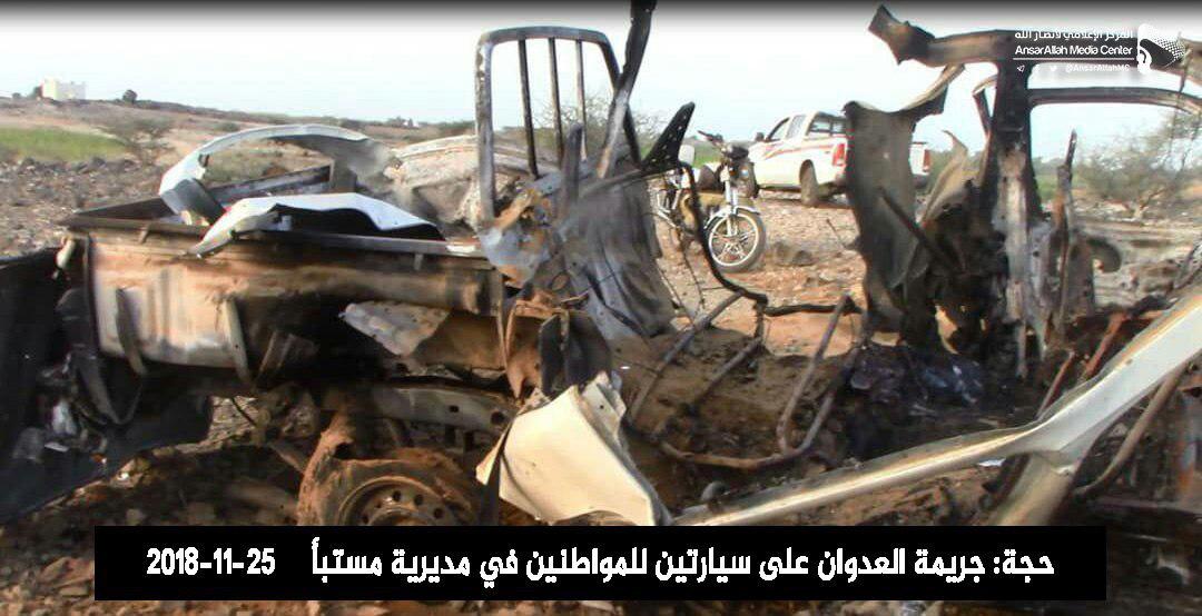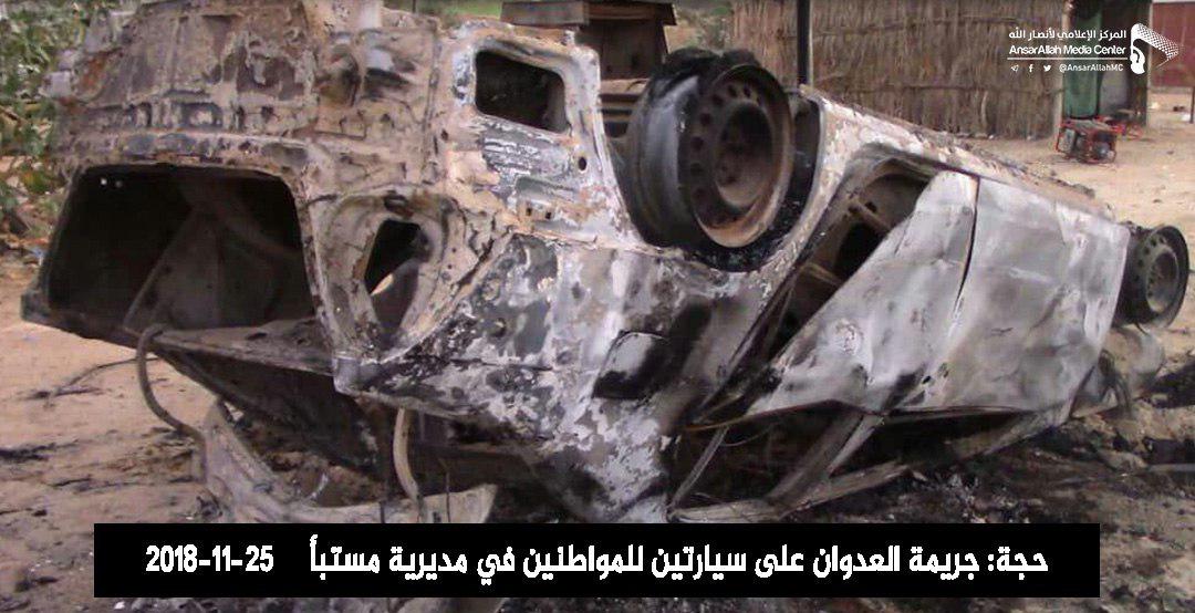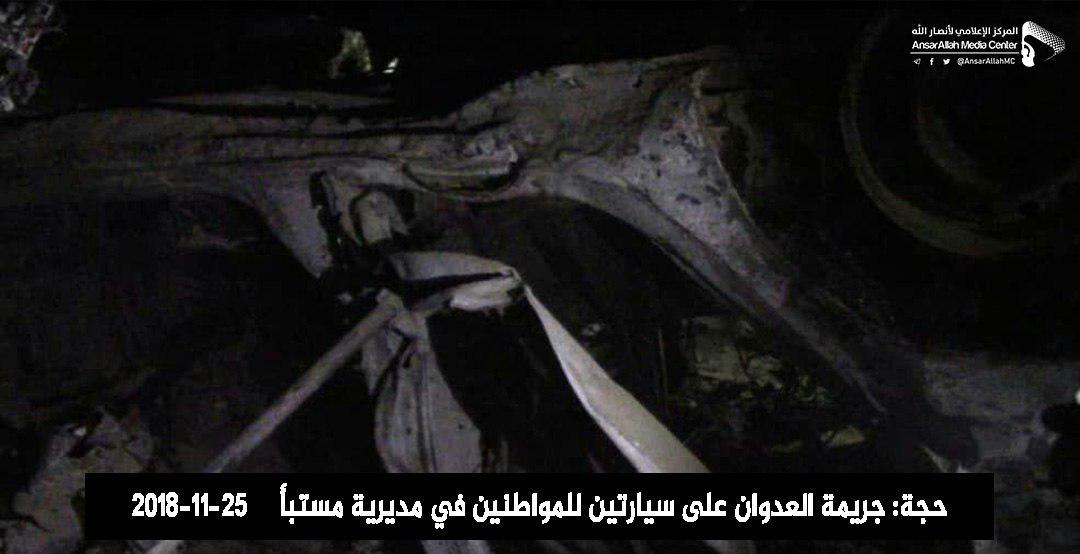 إستهدف طيران العدوان السعودي الأمريكي، فجر يوم الإثنين، بغارتين جويتين استهدفت الأولى سيارة المواطن محمد عبدالرحمن زيد معظب والثانية سيارة ومحطة بترول للمواطن عبده خموسي بمنطقة الهيجة مديرية مستبأ.