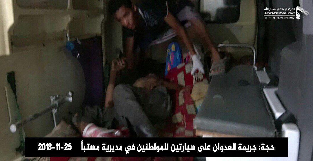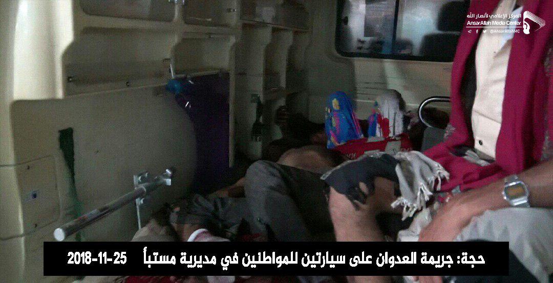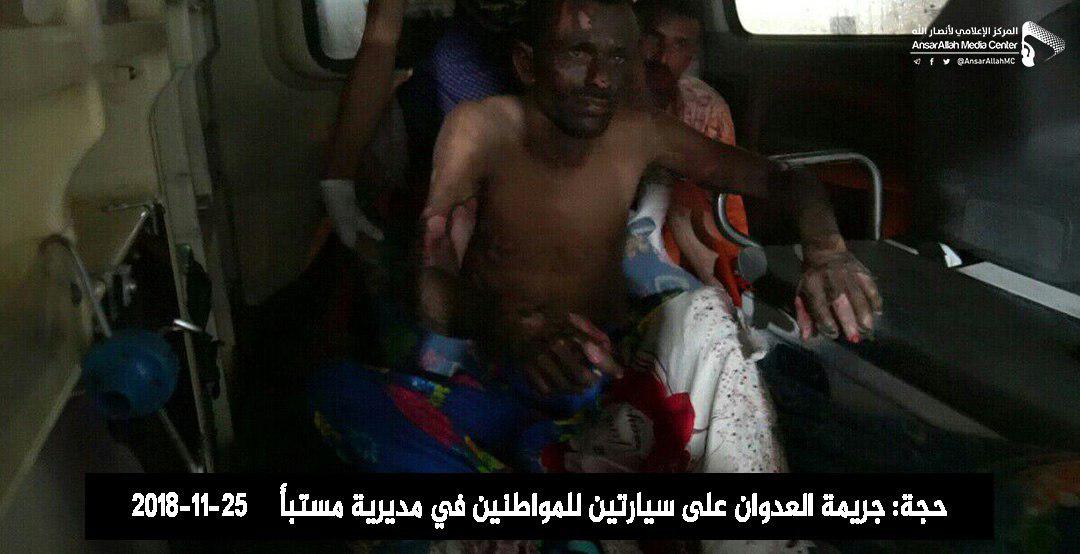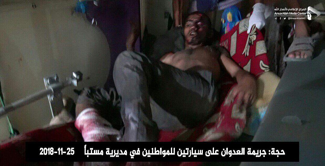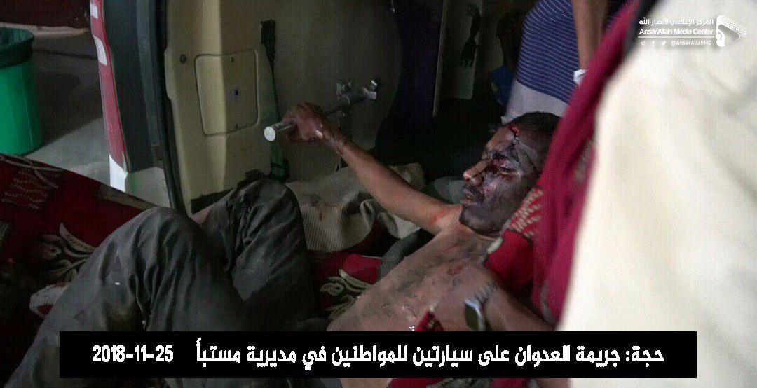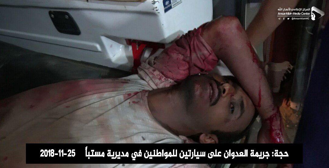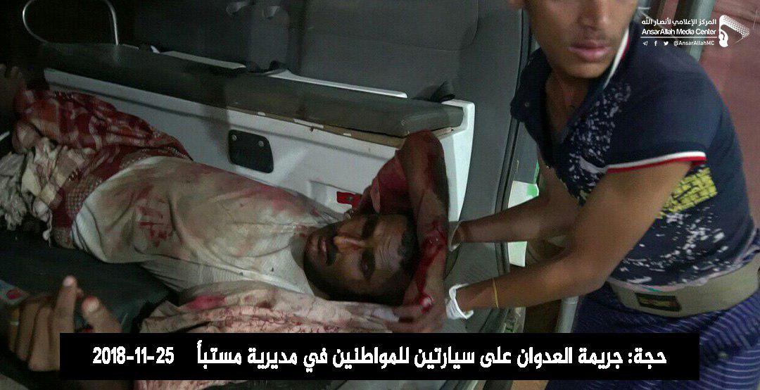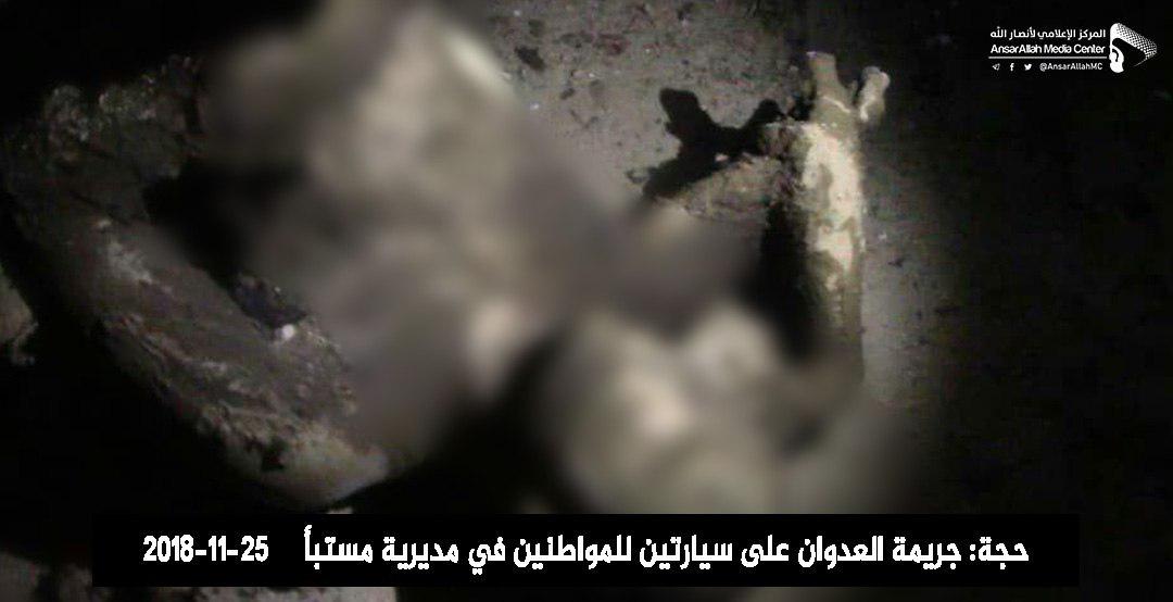 إستهدف طيران العدوان السعودي الأمريكي، فجر يوم الإثنين، بغارتين جويتين استهدفت الأولى سيارة المواطن محمد عبدالرحمن زيد معظب والثانية سيارة ومحطة بترول للمواطن عبده خموسي بمنطقة الهيجة مديرية مستبأ.