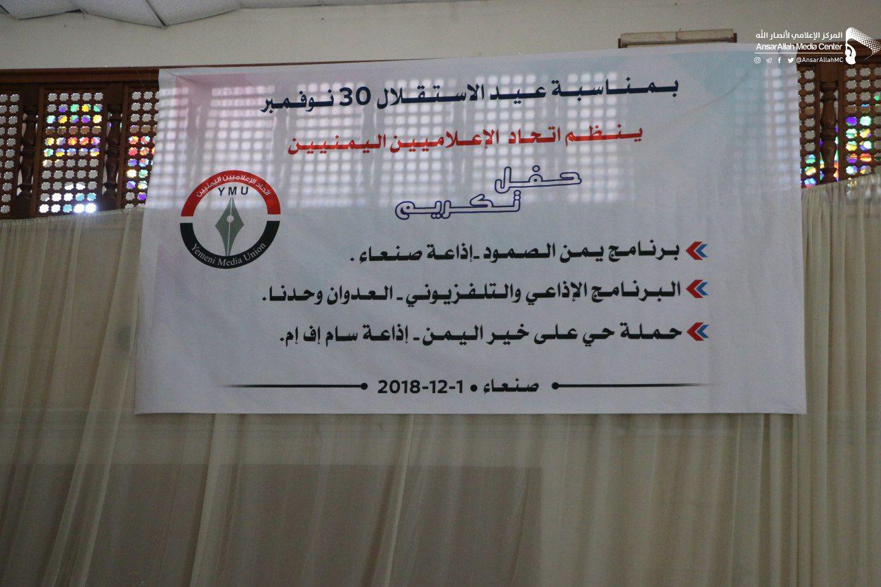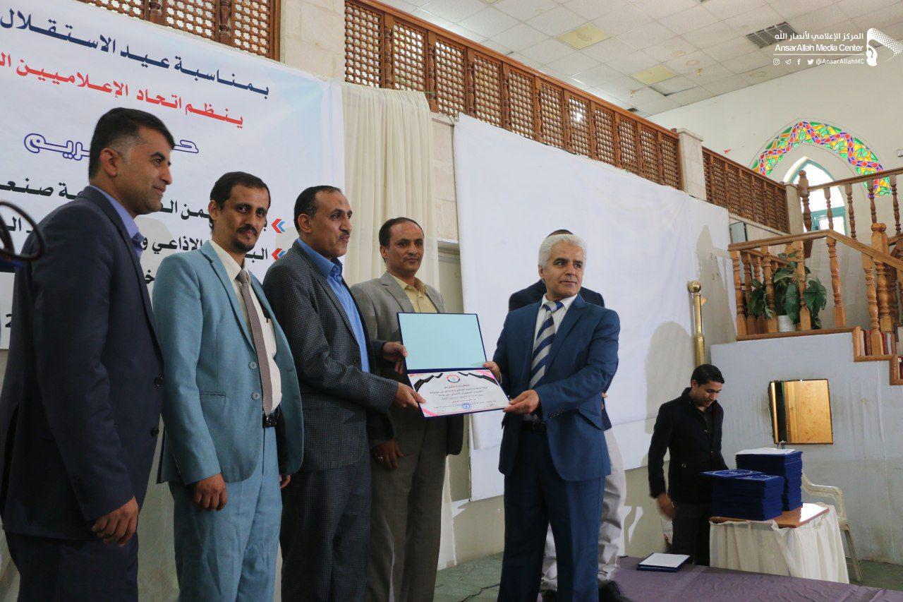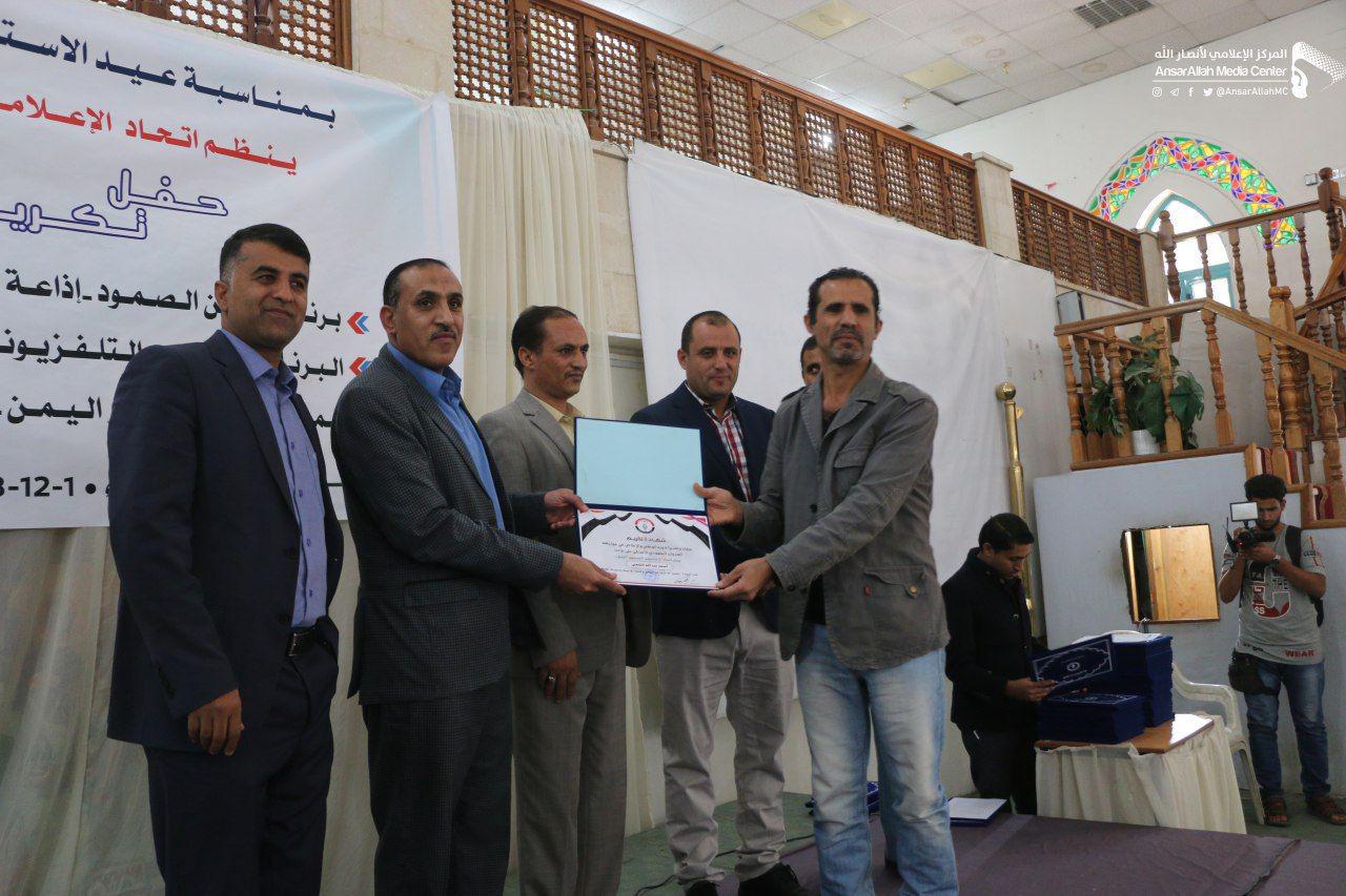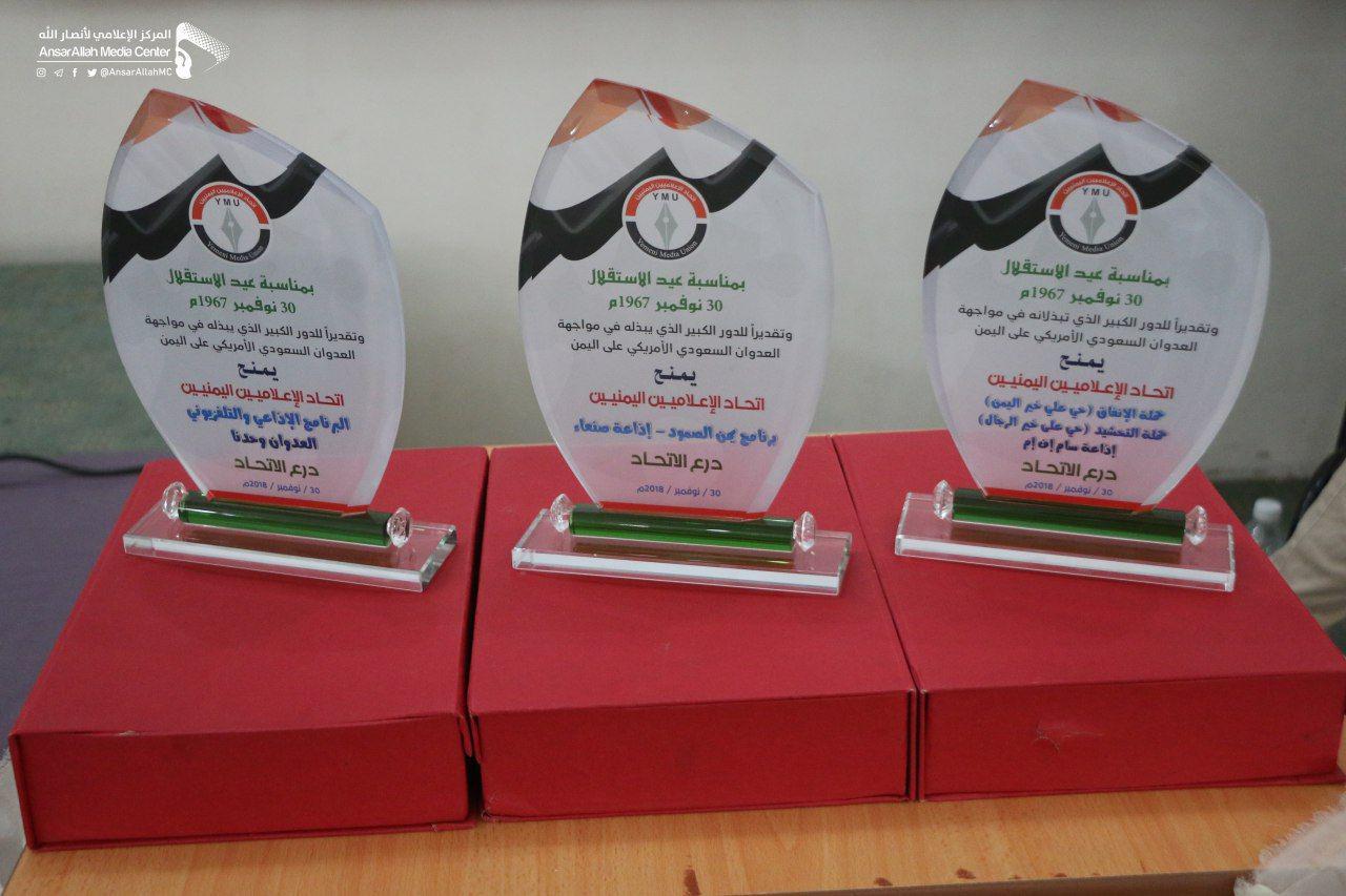 كرم اتحاد الإعلاميين اليمنيين اليوم السبت برنامج يمن الصمود بإذاعة صنعاء، والبرنامج الإذاعي والتلفزيوني العدوان وحدنا، وحملة حي على خير اليمن بإذاعة سام إف إم تزامناً مع الاحتفال بالعيد الـ51 للاستقلال ال30 من نوفمبر.