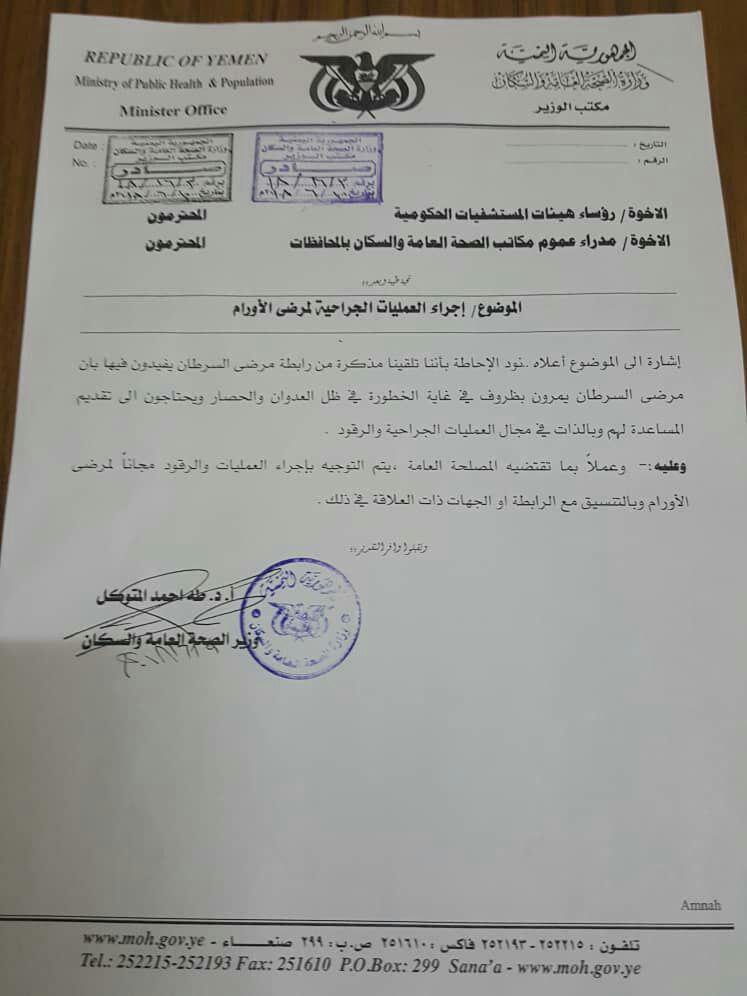 في ظل الظروف الصعبة التي تمر بها اليمن من عدوان وحصار عالمي بقيادة امريكا والسعودية والتي أدت إلى وضع إقتصادي صعب جدا انعكس على الوضع الصحي بشكل كبير مباشر فتأثرت كثير من فئات المجتمع المرضية وعلى رأسها مرضى الأورام السرطانية ليضاف إلى معاناتهم الجسدية معاناة نفسية جراء أرتفاع الأسعار وإنعدام الرواتب وهذا أنعكس بشكل كبير على نفسياتهم لتتضاعف معاناتهم الجسدية السرطانية بامراض نفسية مؤلمة ، لذا سعت وزارة الصحة العامة والسكان منذ ان جاءت قياداها الجديدة بقيادة وزيرها د.طه المتوكل إلى التخفيف من هذه المعاناة من خلال الاجتماع المباشر مع مسئولي رابطة مرضى السرطان (والذين كان ومازال دورهم عظيم ورائع وبناء وفعال ومتحرك في خدمة مرضى السرطان بكلما قدر لهم ووفقوا إليه ومنها هذه الخطوة العظيمة ) فتم التوجيه مباشرة الى مكاتب و مستشفيات العاصمة صنعاء وبقية المحافظات لإجراء جميع العمليات المرتبطة بالمرض والممكنة أجراءها في اليمن بالمجان ، وبالفعل تفاعل مع التوجيه مدراء مستشفيات العاصمة صنعاء من منطلق استشعارهم بالمسئولية في ظل هذه الظروف وتم الاتفاق والتوقيع على ذلك (كما تلاحظون ذلك في استمارة تحديد الاورام وامكانية اجراءها المرفقة مع هذا البيان).