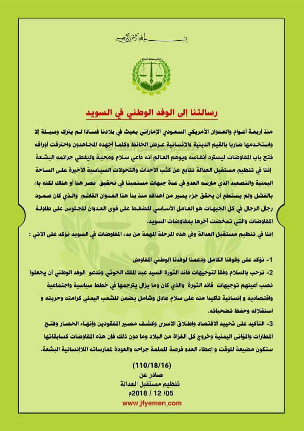 وفي رسالته، أكد تنظيم مستقبل العدالة على عدة نقاط رئيسية خلال هذه المرحلة المهمة منذ بدء المفاوضات في السويد.. وهي كالأتي:
