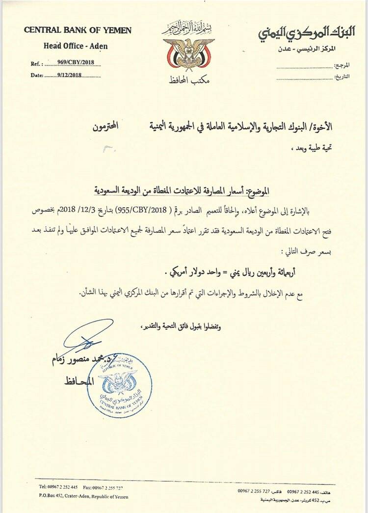 يشار إلى أن البنك المركزي اليمني غطى اعتمادات مستنديه للتجار من الوديعة السعودية خلال الفترة القليلة الماضية بـ356 مليون دولار من الوديعة السعودية، إلا إنه مؤخراً يواجه صعوبة في الحصول على موافقة الجانب السعودي على تغطية تلك الاعتمادات.
