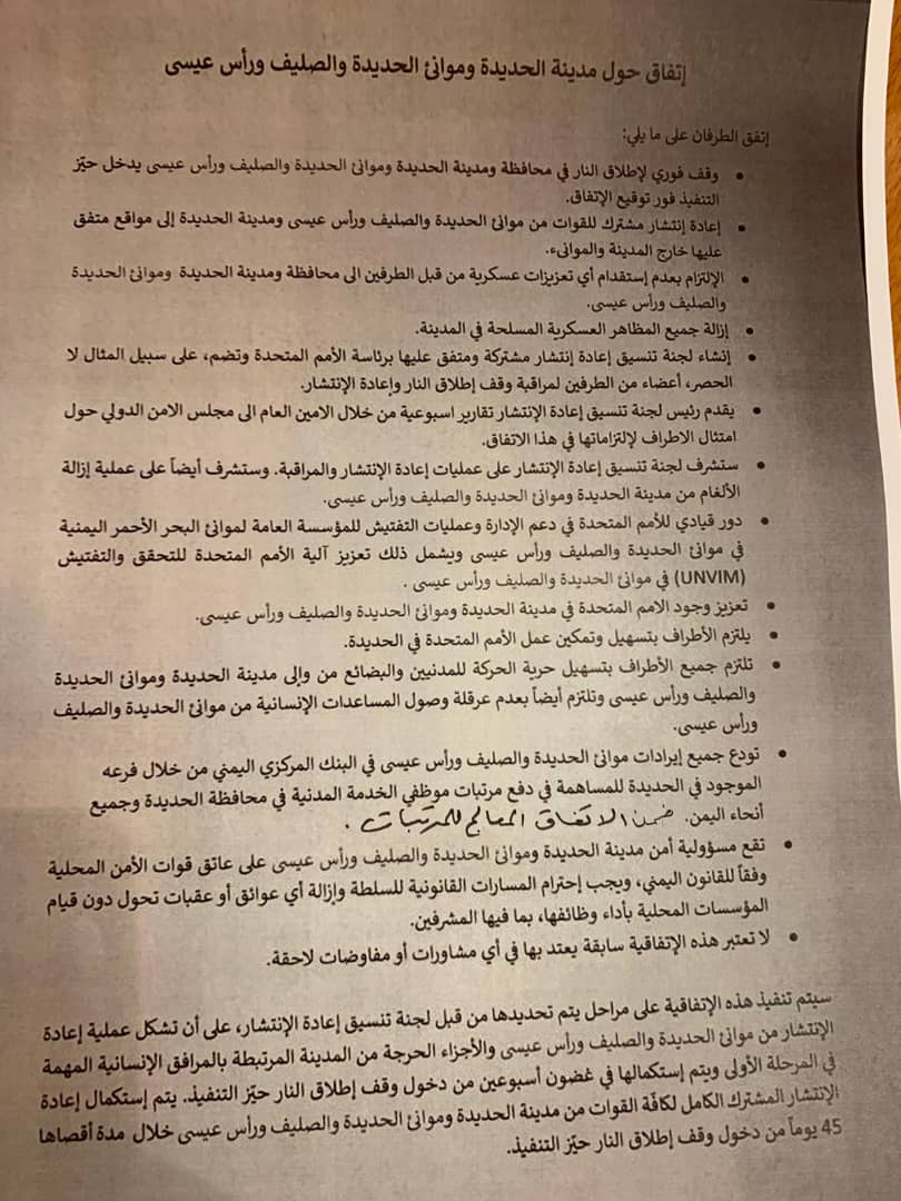– وقف فوري لإطلاق النار في محافظة ومدينة الحديدة وموانئ الحديدة والصليف ورأس عيسى يدخل حيز التنفيذ فور توقيع الاتفاق.