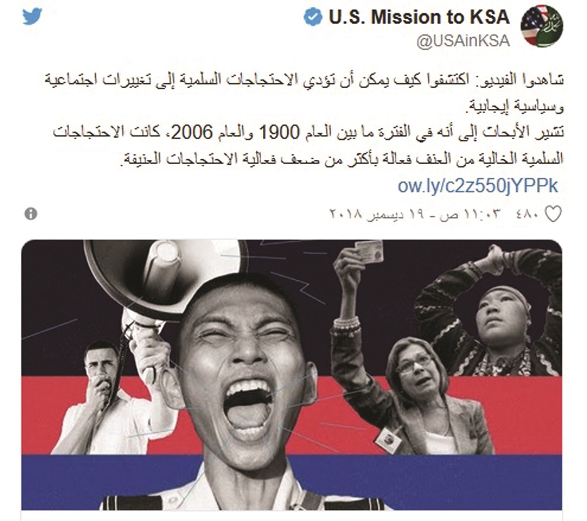 وباللغة العربية والإنجليزية، غرد الحساب الرسمي للسفارة الأمريكية في الرياض والقنصليات في جدة والظهران، عبر «تويتر»: «شاهدوا الفيديو: اكتشفوا كيف يمكن أن تؤدي الاحتجاجات السلمية إلى تغييرات اجتماعية وسياسية إيجابية».