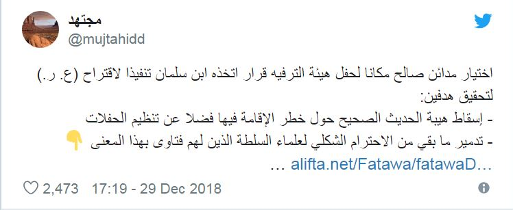 وقال “مجتهد” في تغريدة على حسابه عبر “تويتر”، إن “اختيار مدائن صالح مكانا لحفل هيئة الترفيه قرار اتخذه ابن سلمان؛ تنفيذا لاقتراح (ع. ر.)؛ لتحقيق هدفين”.