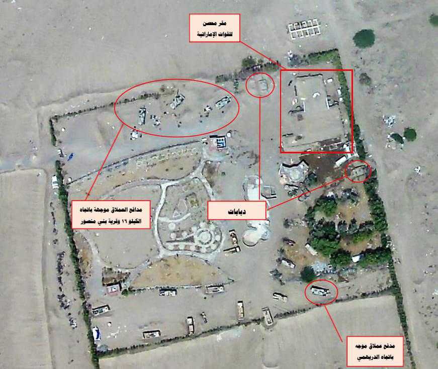 كما عرض ناطق قوات صنعاء، صورة جوية لموقع يتجمع فيه قيادات إماراتية، نصبت فيه مدافع عملاقة لقصف أحياء الحديدة وكيلو 16 ومدينة الدريهمي.