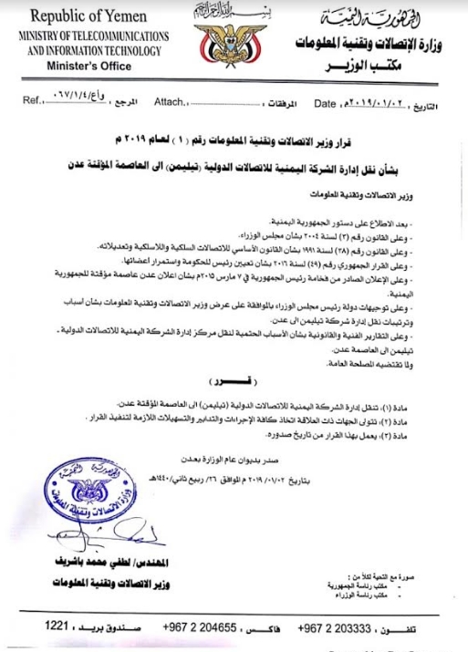 كشفت وثيقة عن قرار أصدره وزير الاتصالات وتقنية المعلومات في حكومة هادي، لطفي باشريف، قرار حمل رقم “1” لعام 2019م، وقضى بنقل إدارة الشركة اليمنية للاتصالات الدولية (تيليمن) إلى عدن.