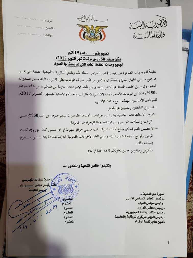 أصدرت وزارة المالية بحكومة الإنقاذ في صنعاء تعميم ينص على صرف نصف مرتب لموظفي الدولة مدنيين و عسكريين.