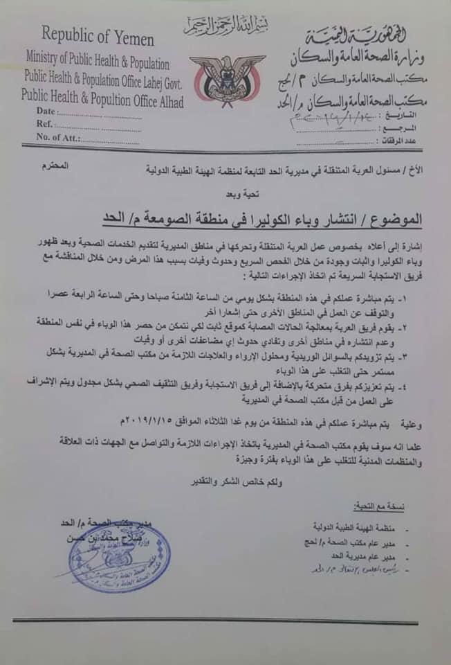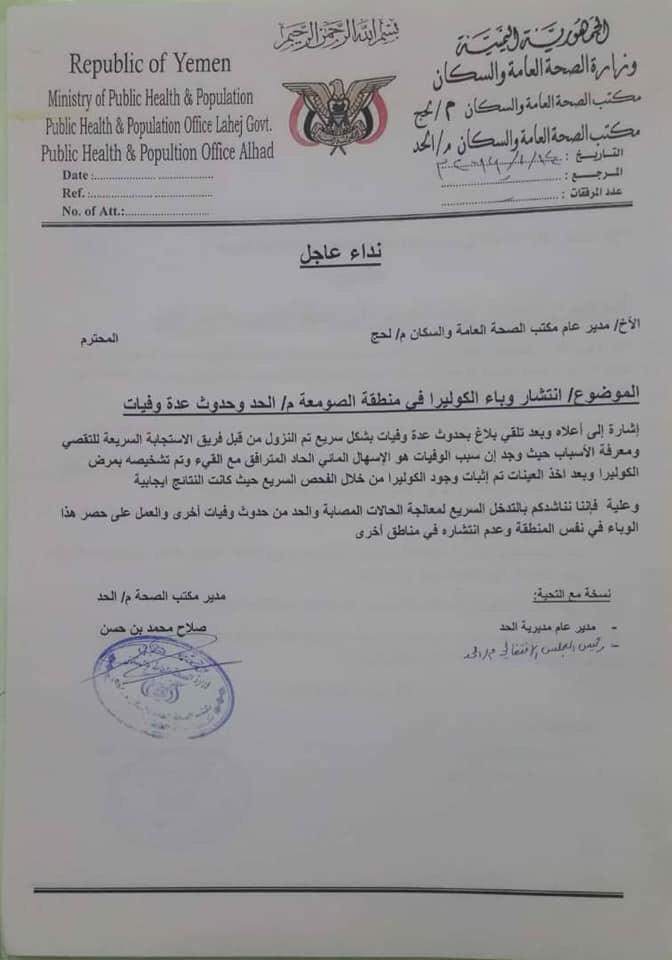 مدير المجلس المحلي بمديرية الحد، ومكتب الصحة والسكان، ناشدوا المنظمات الدولية بالتدخل العاجل لإنقاذ حياة السكان. لكن، يبدو أن وباء الكوليرا وجد في اليمن ملاذاً خصباً ليوزع الموت كيفما شاء، فبعد أن شهد انحساراً نسبياً خلال الأشهر الماضية، ها هو يعود ليتفشى على أبواب البلاد من جديد.