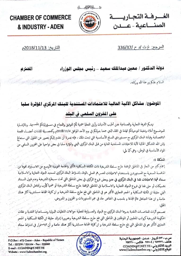 ولفتت إلى أن اشتراط محافظ البنك زمام دفع قيمة الاعتمادات نقداً ومقدماً عند وصول الموافقة النهائية من السلطات السعودية أثّر سلباً على قدرة الشركات على الاستيراد بكميات كبيرة والحفاظ على مستوى تخزين مناسب يحقق الحد الأدنى من مستوى الأمن الغذائي المطلوب لمواجهة كارثة المجاعة المحدقة بالوطن، يضاف إلى أن تلك الشروط اضعفت قدرة الشركات على البيع بالائتمان وأضعف حركة التجارة ومعدلات دوران رأس المال.