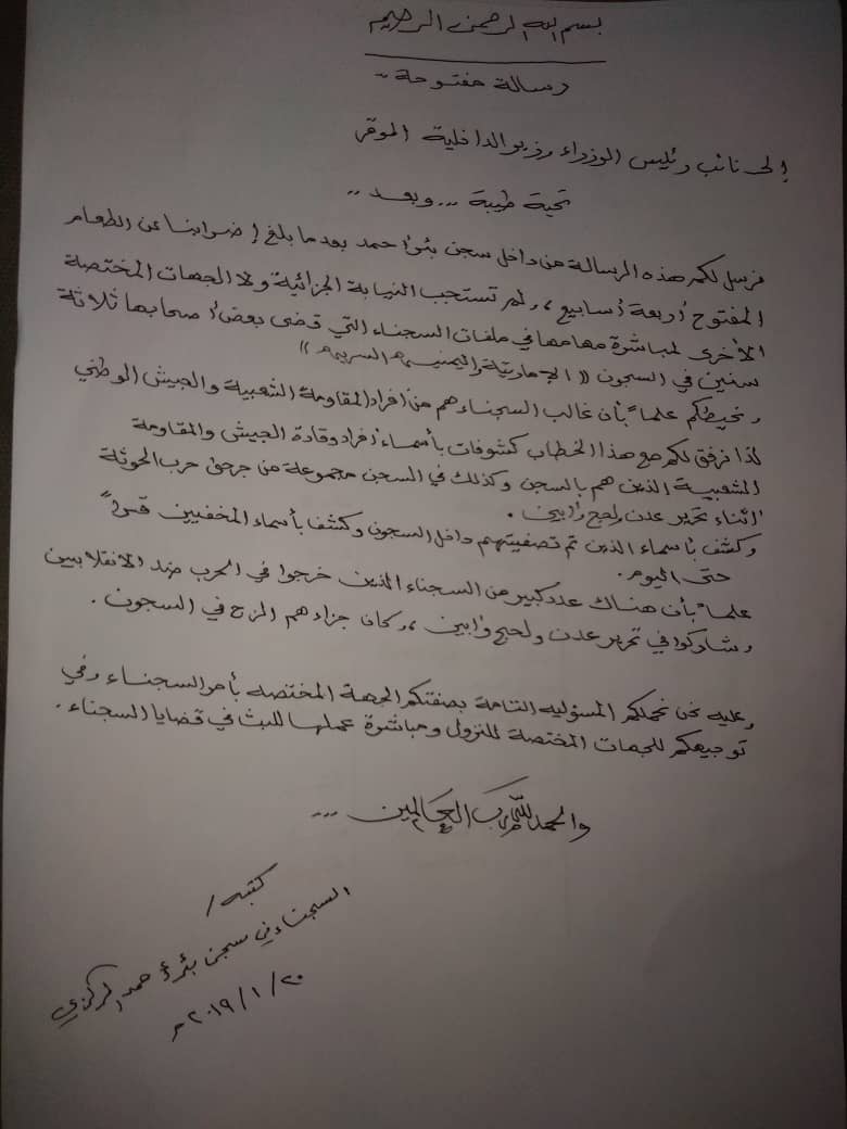 البيان الصادر عن السجناء في سجن بئر أحمد الشهير بمدينة عدن، والموجه إلى وزير الداخلية بحكومة هادي أحمد الميسري، أفادت أن أغلب السجناء هم من أفراد “المقاومة الشعبية” وقوات “الجيش الوطني”، الذين واجهوا الحوثيين.