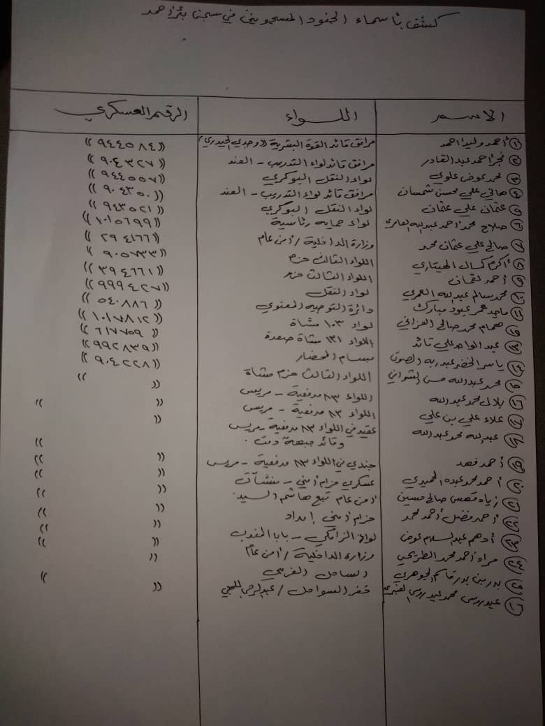 وتضمن البيان -الذي تداوله عدد من النشطاء- “وجود 16 سجيناً من أفراد الجيش لا يزالون في سجن بئر أحمد”، موضحة أنه ” الجهات المعنية لم تتجاوب مع مطالبهم بالنظر في ملفاتهم”.