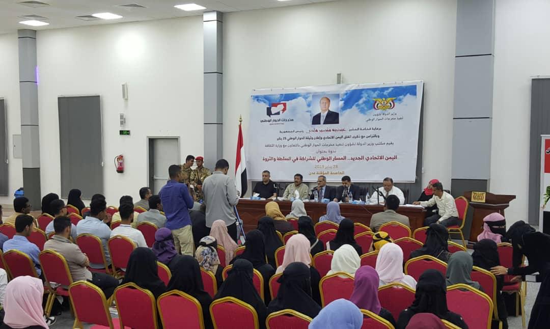 وأقام وزير الدولة لشؤون مخرجات الحوار الوطني بحكومة هادي، ياسر الرعيني، وعدد من مناصري حكومته بإحدى القاعات في عدن ندوة بعنوان (اليمن الاتحادي الجديد ..المسار الوطني للشراكة في السلطة والثروة) ومع بدء الفعالية قام مسلحو المجلس باقتحام القاعة وطرد الوزير والمشاركين في الندوة.