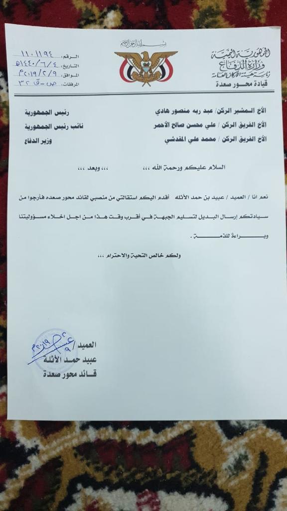 أعلن قائد محور صعدة الموالي للتحالف، العميد عبيد الأثلة، اليوم الأربعاء، استقالته كقائد لمحور صعدة العسكري، شمالي اليمن.