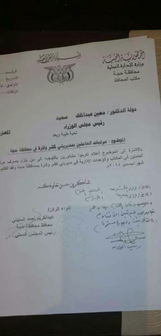 وكانت وثيقة صادرة عن رئيس حكومة «الشرعية» معين عبد الملك منذ أيام، قد قضت بتسليم رواتب لأبناء مدريتي كشر وقارة بمحافظة حجة، وهو إجراء يؤكد استغلال حكومة هادي لأوضاع المواطنين، ويكشف أجندة تلك الحكومة ومن خلفها «التحالف»، في سعيهما إلى ربط حقوق مكتسبة دستورياً وقانونياً بالمشاركة في القتال وفتح جبهات في عدد من المديريات ضد «الحوثيين».