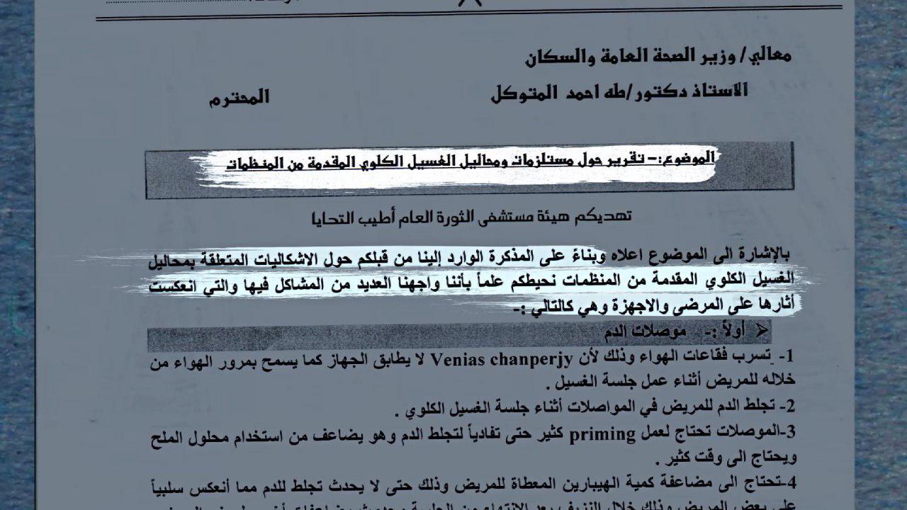 مع سعينا لمعرفة تفاصيلَ شاملةٍ حول تداعيات هذه المساعدات، اتضح لنا أنها مقدمةٌ من منظّــمة الصحة العالمية، هذه الوثيقة الرسمية التي حصلنا عليها تؤكّـــد ذلك وتعرض التداعيات التي لحقت المرضى وأجهزة الغسيل..