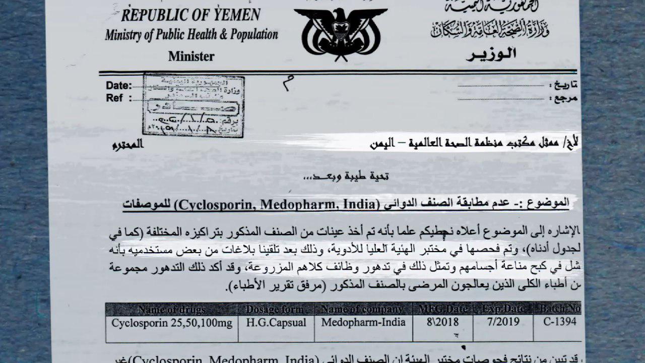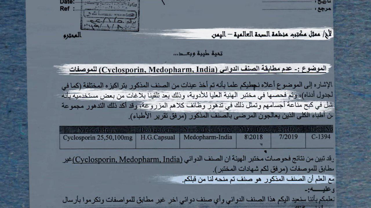 في التحقيق بحثنا مع الهيئة العليا للأدوية والمستلزمات الطبية شكاوى زارعي الكلى فتبين أنها أُخضعت لفحص مختبرها عيناتٍ عشوائيةً من صنف السيكلوسبورين هندي المنشأ وهو أحدُ أدوية تثبيط المناعة التي أمّنتها منظّــمةُ الصحة، فأكّـــدت النتائجُ شكاوى المتضررين، كما أشار لذلك رئيس الهيئة الدكتور محمد المداني الذي وضع بين أيدينا شهادات المختبر التابع للهيئة أَيْــضاً: “تم إحالةُ عينات من صنف السيكلوسبورين للفحص والتحقق من أمانة وجودة المنتج، ففشل المنتج في تجاوز الاختبارات في المختبر الوطني للرقابة الدوائية”، ويتابع المداني: “عملنا مذكرة إلى وزارة الصحة والى منظّــمة الصحة العالمية بإيقاف صرف مثل هذا الدواء وتم التحفظ على الكمية وتم ايقافها، أبلغنا المنظّــمة وابلغنا الوزارة بان المنتج أثبت أنه فاشل وبأن هذا الموضوع يعتبر خطير جِـدًّا”.