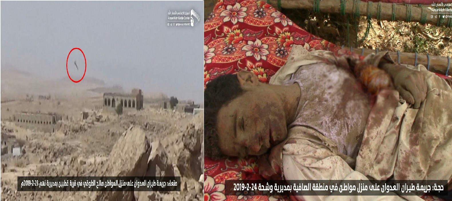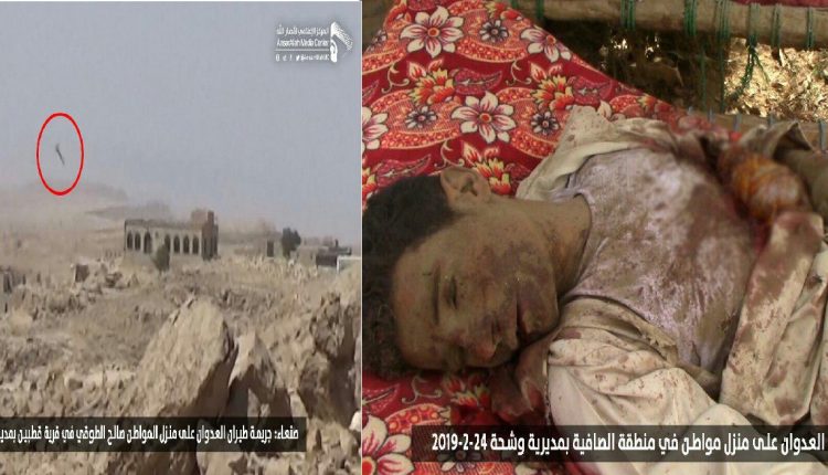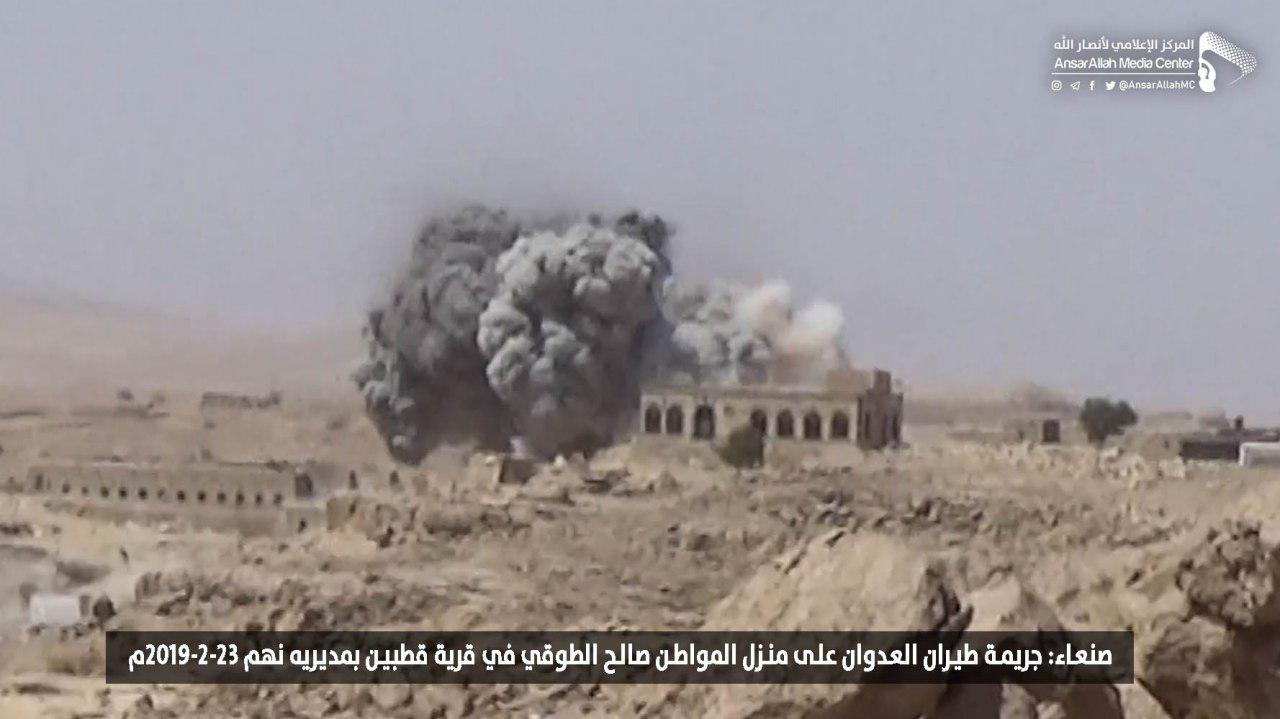 شنّ طيران التحالف السعودي الإماراتي، غارات جوية، اليوم الأحد، على منزلين لمدنيين في مديرية وشحة بمحافظة حجة ومديرية نهم بمحافظة صنعاء، مخلف جرائم جديدة راح ضحيتها 6 مدنيين.