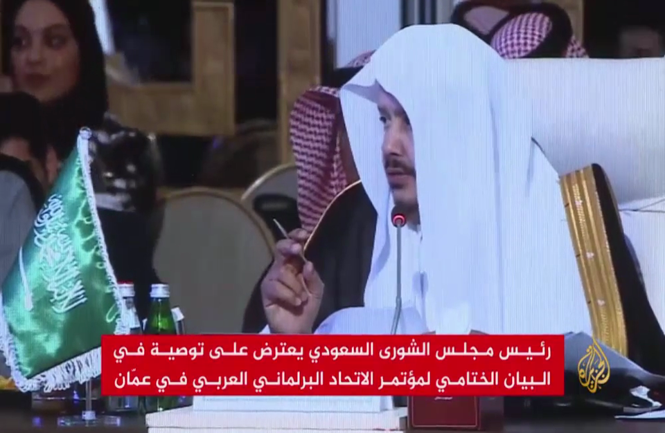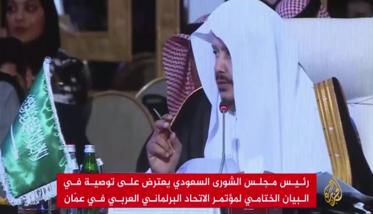 اعترض رئيس مجلس الشورى السعودي، عبدالله آل الشيخ، اليوم الاثنين، على بيان مؤتمر البرلمانيين العرب المنعقد في العاصمة الأردنية عمّان؛ لمطالبته بوقف التطبيع مع “إسرائيل”.