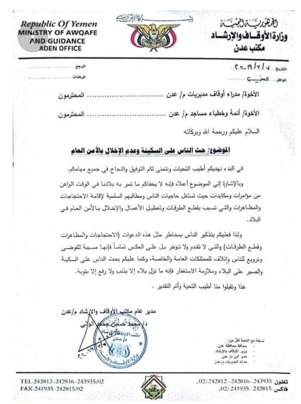 وحصل “متابعات” على نسخة من التعميم الموجه إلى خطباء وائمة مساجد عدن، الذي وجه الخطباء بتذكير الناس بـ “مخاطر الدعوات إلى التظاهر”، التي وصفها بأنها “استغلالا لحاجة الناس وتهدف إلى تعطيل حاجة الناس، والاخلال بالأمن والأمان”.