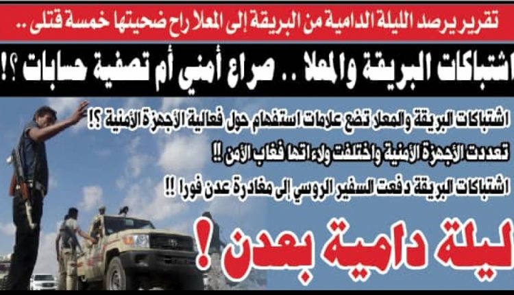 بزغت شمس أمس السبت كاشفة عن خمس قتلى سرقت أرواحهم عند الفجر بعد اشتباكات دامت لساعات بين مسلحين غاضبين وقوى أمنية في البريقة واشتباكات أخرى في المعلا.. وجاءت اشتباكات البريقة بعدما داهمة قوى أمنية منازل مطلوبين أمنياً عصر أمس الأول الجمعة والتي بسببها انتشر مسلحون من أهالي المدينة ليشتبكوا لاحقاً مع القوى الأمنية.