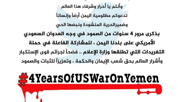 أعلنت وزارة الإعلام التابعة لحكومة الحوثيين في صنعاء، عن إطلاقها حملة تغريدات على مواقع التواصل الاجتماعي الساعة الثامنة من مساء اليوم الأحد بمناسبة ما وصفته مرور “أربعة أعوام من الصمود في وجه العدوان السعودي الأمريكي على اليمن”.