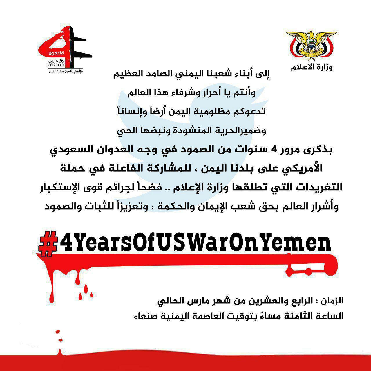 ولفت الوزير إلى أهمية المشاركة الواسعة بحملة التغريدات إزاء ما يتعرض له اليمن أرضا وإنسانا من جرائم وانتهاكات يندى لها جبين الإنسانية وذلك على الهاشتاق الآتي: #4YearsOfUSWarOnYemen