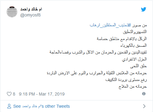 وقالت والدة التويجري في تغريدة، إن النظام السعودي يتبع أساليب مختلفة في تعذيب المعتقلين منها “التسهير والتعليق، والركل بالأقدام في مناطق حساسة، إلى جانب الصعق بالكهرباء، وتقييد اليدين والقدمين، والحرمان من الأكل والشرب وقضاء الحاجة، والعزل الانفرادي”.