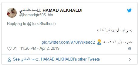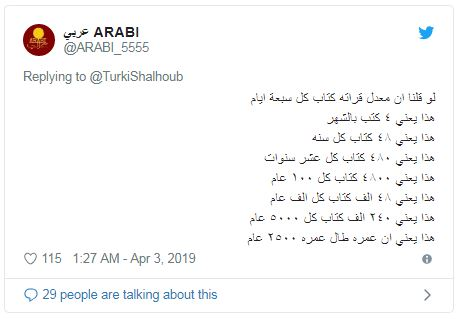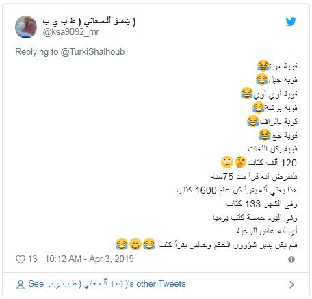 وأجرى بعض الناشطين عملية حسابية للرقم الذي ذكره الحربي، قائلين إنه “بافتراض أن الملك (83 سنة) بدأ القراءة من سن الخامسة، فإن ذلك يعني أنه يقرأ يوميا أكثر من أربعة كتب”.