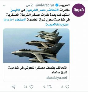 قامت قناة العربية التابعة للتحالف السعودي بحذف التغريدية بعد 10 ساعات من نشرها التي أعلنت فيها استهداف طيران التحالف حي سعوان بعدة غارات، والذي تسبب بحدوث مجزرة مروعة بحق سكان الحي وطالبات مدرسة الشهيد الراعي.