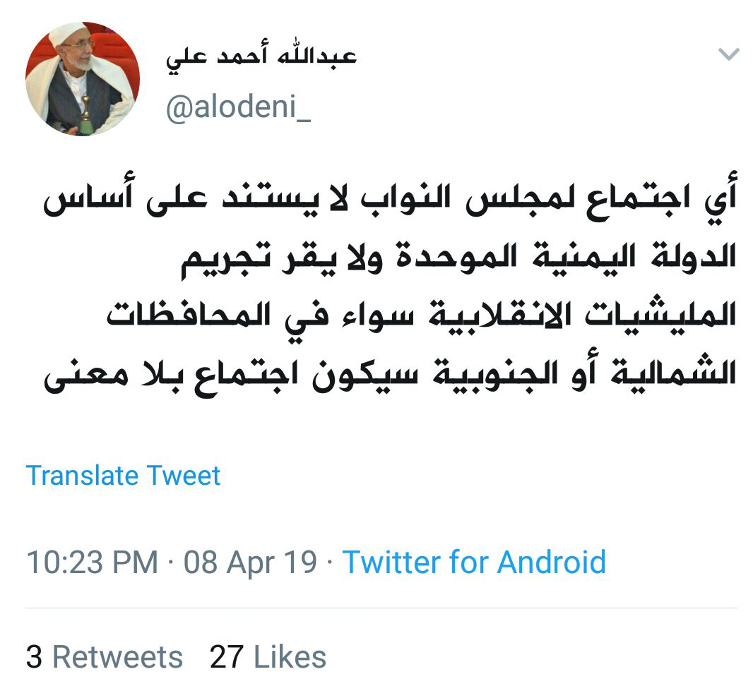 وكتب عبدالله أحمد العديني، وهو عضو مجلس النواب، تغريدة على حسابه في “تويتر” قال فيها إن أي اجتماع لمجلس النواب لا يقوم على أساس الدولة اليمنية الموحدة وتجريم المليشيات الإنقلابية سواء في الشمال أو في الجنوب سيكون إجتماعاً بلا معنى.