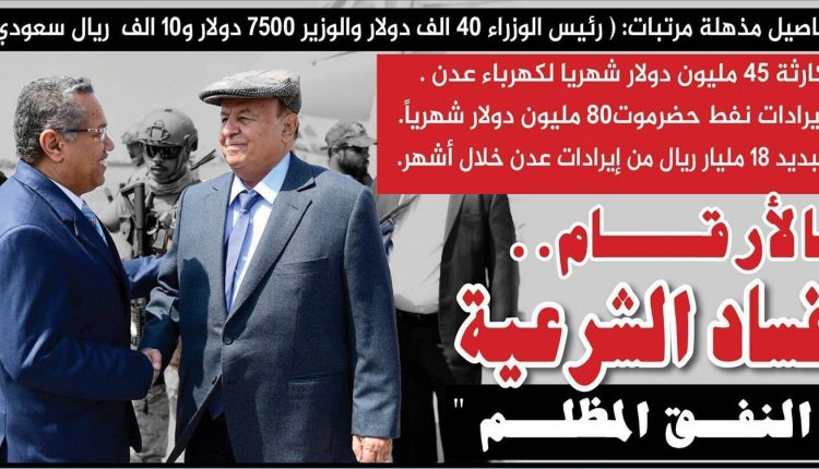 وقد بدأت كشف نهب إيرادات الجنوب عندما أكّد محافظ عدن المستقيل/عبدالعزيز المفلحي: إنّ عدن هي المحافظة الوحيدة التي ترفد البنك المركزي بـ الإيرادات من الضرائب والجمارك، وإنّ من المغالطة أن يتمّ ذكر محافظة مأرب وحضرموت والمهرة أنّها تورد إيرادات الضرائب والجمارك للبنك المركزيّ في عدن” والإيرادات التي كانت في طريقها للحوثيين قادمة من عدن العدد الكبير من كبار سرطان الشرعية يحصلون شهر كتقدير متواضع على ما لا يقل عن ثلاثين مليون دولار وكذلك مايتم صرفه على تحركات الحكومة.