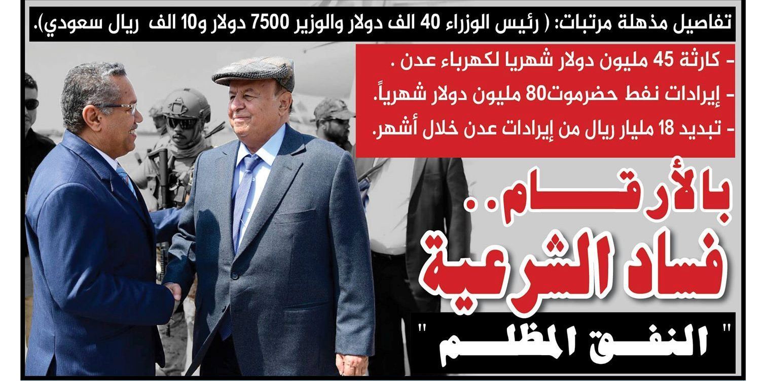 ومنذ بداية الحرب في 26 مارس 2015م والشرعية تعيش على إيرادات الجنوب من حضرموت إلى عدن والتي تنهب الحكومة إيراداتها وتصرفها كمرتبات لاعضاء الحكومة وأسرهم في الخارج كونها تصل الى يد الحكومة مضاف اليها الأموال المطبوعة التي أهدرتها حكومة بن دغر في حين كل محافظات الجنوب تعيش حالات انهيارات تامة في الخدمات وعدم دفع مرتبات الموظفين.