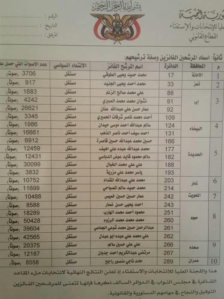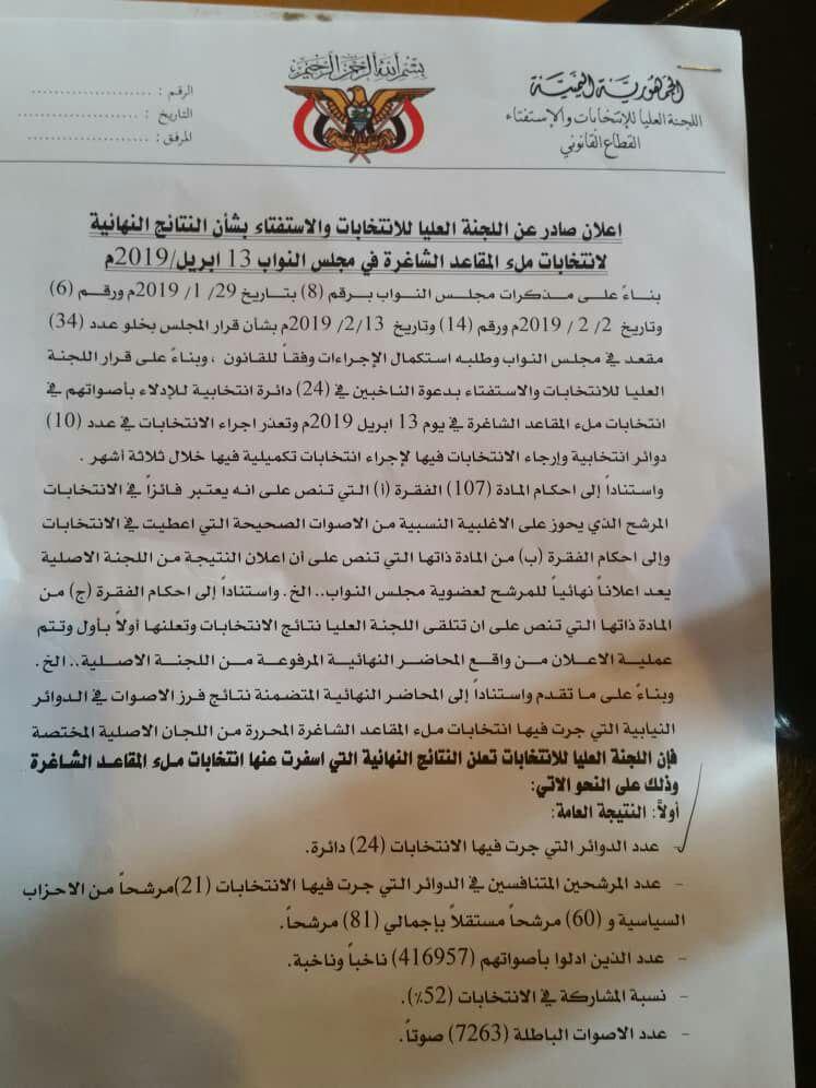 أعلنت اللجنة العليا للإنتخابات والإستفتاء، اليوم الإثنين، خلال مؤتمر صحفي في العاصمة صنعاء نتائج الانتخابات التكميلية لعضوية مجلس النواب، التي جرت السبت الماضي.