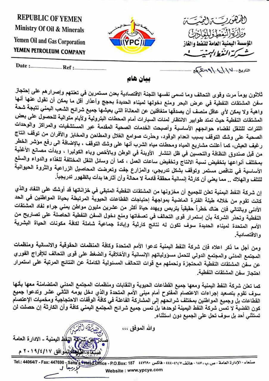 وقال بيان صادر عن الشركة، إن شركة النفط تعلن للجميع أن مخزونها من المشتقات النفطية المتبقي في خزانتاتها قد أوشك عللى النفاد ما يعني أن هناك خطرا حقيقيا يتربص ويهدد حياة 20 مليون مواطن يمني.