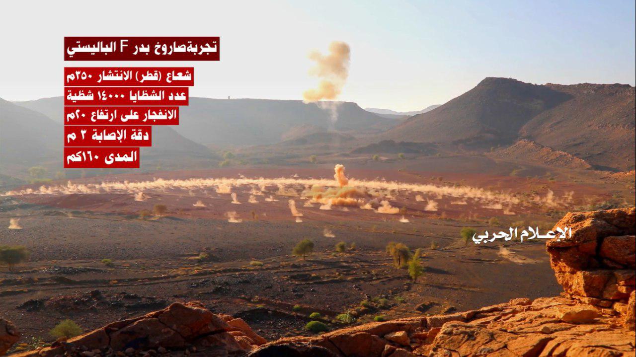 وأعلن المتحدث الرسمي باسم قوات الحوثيين، العميد يحيى سريع، عن خصائص الصاروخ الذي يحمل اسم “بدر F”، حيث قال إن الصاروخ بمدى 160 كم وينفجر من الأعلى على ارتفاع 20 متر فيما يبلغ قُطر دائرة الانفجار 350 متر كما يتسم بقدرة تدميرية هائلة حيث يبلغ عدد الشظايا التي ينفجر بها الصاروخ 14000 شظية.