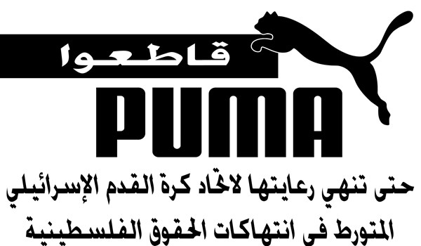تنظم حركة “قاطعوا إسرائيل” (BDS) حملة موسعة لمقاطعة شركة “بوما” (Puma) للملابس والأدوات الرياضية، بسبب دعمها للمستوطنات الإسرائيلية غير الشرعية على الأراضي الفلسطينية، لكونها الراعي الرسمي للاتحاد الإسرائيلي لكرة القدم (IFA) الذي يضم فرقًا في مستوطنات الكيان إلاسرائيلي غير الشرعية على الأراضي الفلسطينية المحتلة.