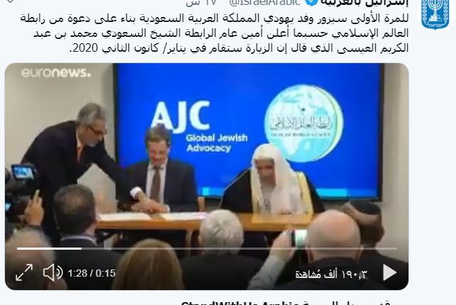 وكان قد أعلن العيسي أمين عام ما تسمى الرابطة خلال برنامج جمعه مع سياسيّ صهيوني على قناة “يورو نيوز” الأوروبية، أن وفداً يهودياً سيزورُ المملكةَ بدعوة واستضافة من ما تسمى الرابطة العالم الإسْلَامي، مدعياً أن القيم والإنْسَانية هي من جعلتهم يدعو إلى الزيارة، موضحاً أن موعد الزيارة سيكون في يناير 2020.