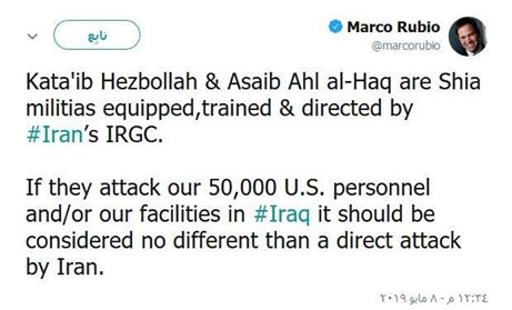 وزعم روبيو في تغريدة على صفحته بموقع التواصل الاجتماعي “تويتر” أن “هناك فصائل في العراق تجهز وتدرب بشكل مباشر من الحرس الثوري الايراني”.