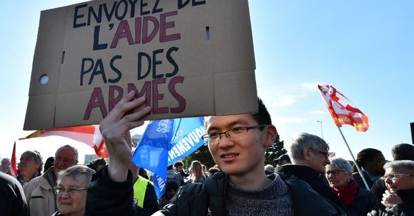 محتجون في فرنسا يرفعون لافتات لأطفال اليمن بعد صفقة السلاح الجديدة مع السعودية