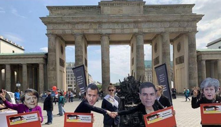 وارتدى 4 محتجين أقنعة تجسد وجوه الرئيس الفرنسي “إيمانويل ماكرون”، ورئيس الوزراء الإسباني “بيدرو سانشيز”، والمستشارة الألمانية “أنغيلا ميركل”، ورئيسة الوزراء البريطانية “تيريزا ماي”.