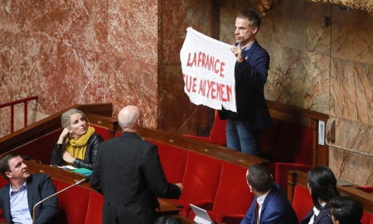 و”سيباستيان نادو” هو النائب الذي كان قد تم استبعاده في ديسمبر/كانون الأول الماضي من الكتلة البرلمانية لحركة “الجمهورية إلى الأمام” على خلفية تقديمه شكوى لدى المفوضية الأوروبية لبيع أسلحة بشكل غير قانون ورفعه لافتة كتب عليها “فرنسا تقتل في اليمن” في الجمعية الوطنية.