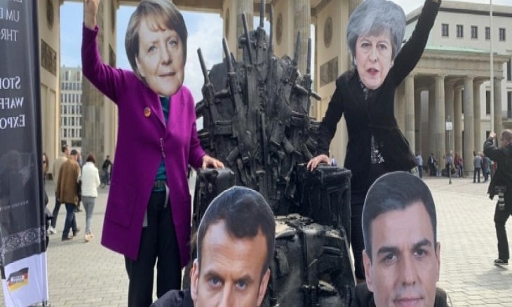 وأقيمت الوقفة في ميدان “18 مارس” مقابل بوابة براندنبورغ الشهيرة ورفع المشاركون لافتات تطالب ألمانيا ودول الاتحاد بوقف تصدير السلاح لأطراف الحرب باليمن. وارتدى 4 محتجين أقنعة تجسد وجوه الرئيس الفرنسي إيمانويل ماكرون ورئيس الوزراء الإسباني بيدرو سانشيز والمستشارة الألمانية أنجيلا ميركل ورئيسة الوزراء البريطانية تيريزا ماي.
