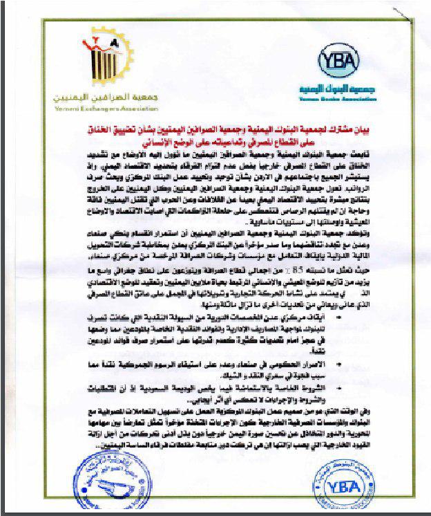 أصدرت جمعيتي البنوك اليمنية والصرافين اليمنين بيان مشترك بشأن الإجراءات الجديدة لبنك عدن المركزي، وما نتج عنها من تضييق الخناق على القطاع المصرفي وتداعياته على الوضع الإنساني في اليمن.