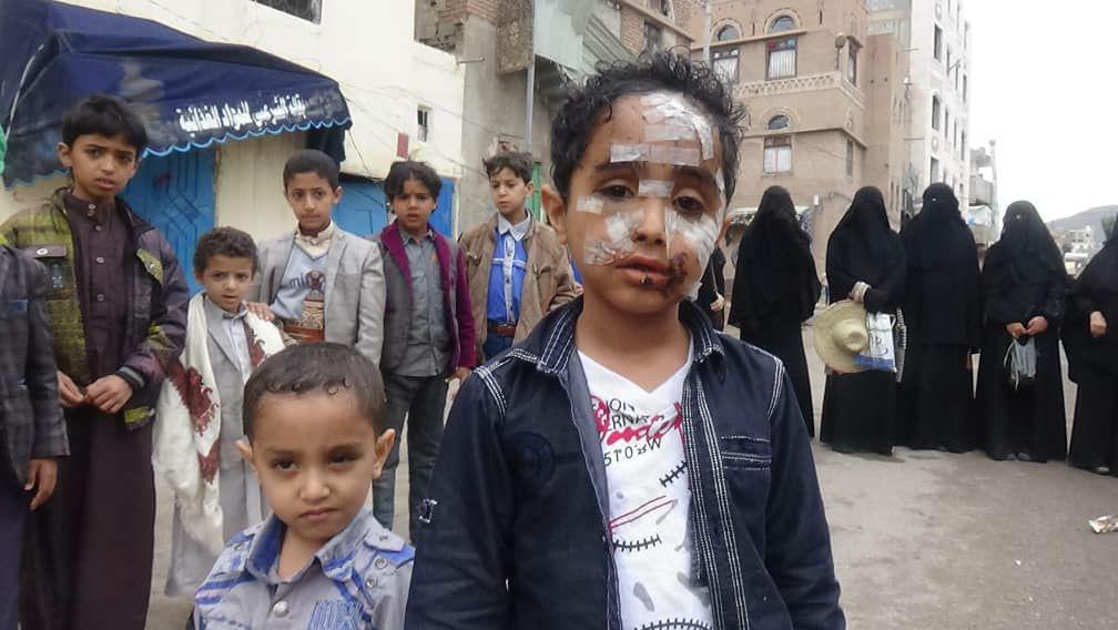نظم عدد من أطفال مديرية معين بأمانة العاصمة وقفة احتجاجية تنديداً بقصف طيران التحالف السعودي الإماراتي لمنازل المواطنين بحارة الرقاص.
