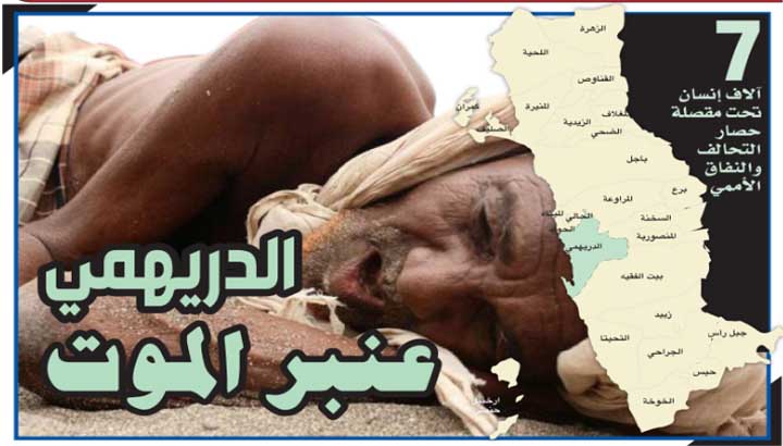عزل تحالف العدوان مدينة الدريهمي عن الحديدة واليمن والعالم بحصار مميت أدى إلى تناقص سكانها الـ7 آلاف من المستضعفين دائماً (النساء والأطفال والمسنين) يوماً بعد آخر بالتجويع وقطع سبل العيش ومنع العلاج عنهم، إضافة إلى قتلهم بشكل مباشر بالغارات والخروقات، صواريخ وقذائف أو رصاص. ويكاد الحصار على المدينة يكمل العام، وبحسب المعلومات عن حال المدينة المحاصرة وأهلها، فإنه لن يبقى في الدريهمي سكان، ولن تكون مديرية للأحياء إذا استمر حصارها لفترة أطول.